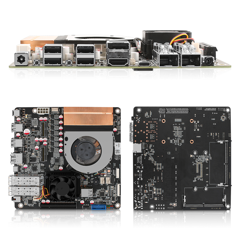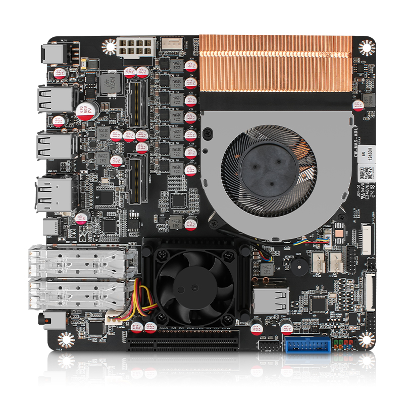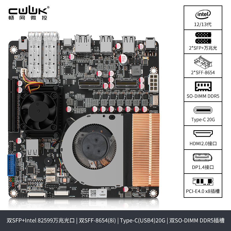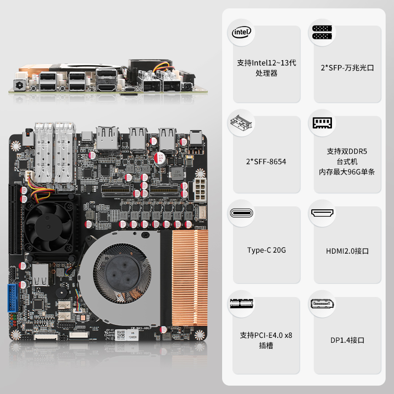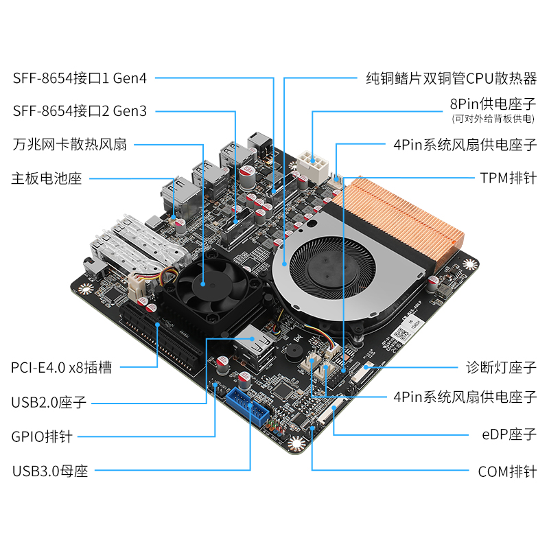 | 板载接口 | 2* SFF-8654接口 | 1 * 万兆网卡散热风扇 | 1 * 主板电池座 |1 * PCI-E4.0 x8插槽 | 1 * 8Pin供电座子(可对外给背板供电) | 1 * 小4Pin系统风扇供电座子 | 1 * 纯铜鳍片双铜管CPU散热器 | 1 * TPM排针 | 2 * USB2.0座子 | 1 * GPIO排针 | 1 * USB3.0母座 | 1 * 诊断灯座子 | 2 * 4Pin系统风扇供电座子 | 1 * eDP座子 | 1 * COM排针 2 * SO-DIMM DDR5 | 1 * TF插槽 |