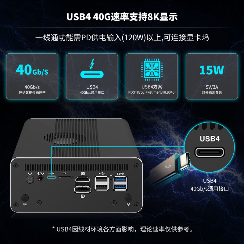 1* 开关机键 | 1 * 二合一音频接口 | 1 * DP1.4a | 1 * HDMI2.0 | 1 * BIOS复位键 | 2 * USB3.2(10Gbps) | 2 * USB2.0 | 1 * Type(40G)(数据显示供电全功能) | 1 * TF插 |
