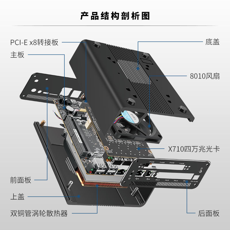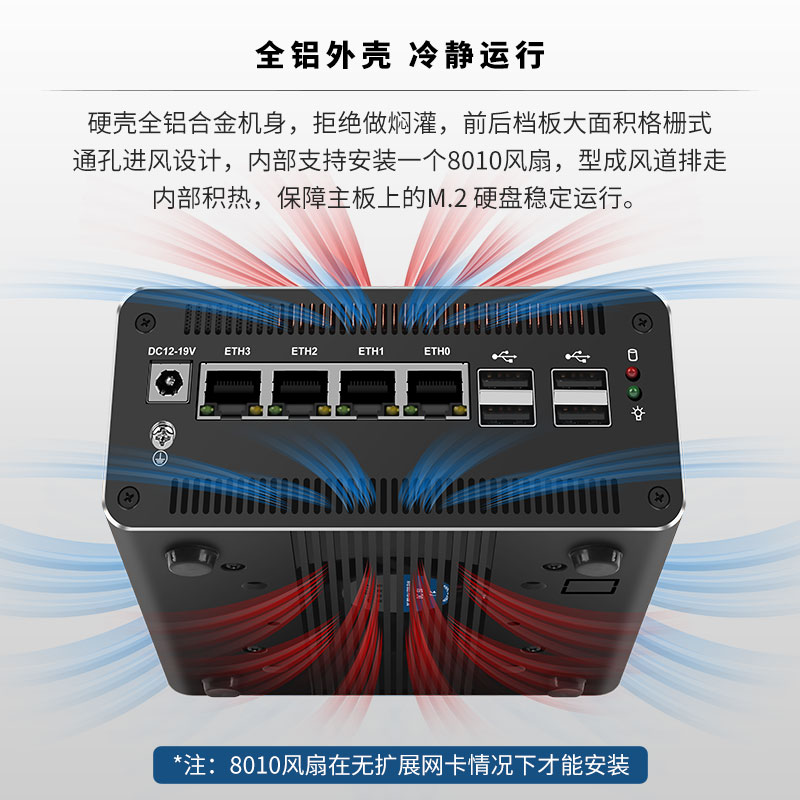 1 * 电源指示灯 | 1 * 硬盘指示灯 | 4 * USB2.0 | 4 * Intel 2.5G网口 | 1 * DC-12V(55*25) |