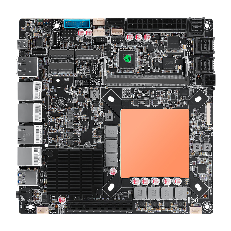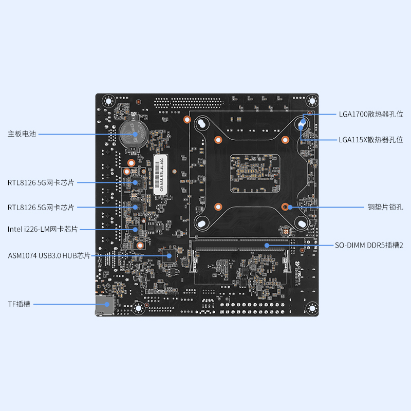 1 * F_PANEL | 1 * USB3.0母座 | 1 * USB2.0排针 | 1 * TYPE-E母座 | 2 * M.2 NVMe 2280 | 1 * M.2 cnvi Wi-Fi | 3 * 系统风扇 | 3 * SFF-8643接口 | 1 * COM排针 | 1 * SATA3.0 | 1 * CLR_CMOS排针 | 1 * USB断电排针 | 1 * PCI-E x8扩展槽 | 1 * ATX-24PIN 供电 | 1 * ATX-4PIN供电 | 2 * SO-DIMM DDR5内存槽 | 1 * 来电自启动跳针 | 1 * eDP接口 | 1 * GPIO排针 | 1 * SATA供电 | 1 * CPU风扇 | 1 * 主板电池 |