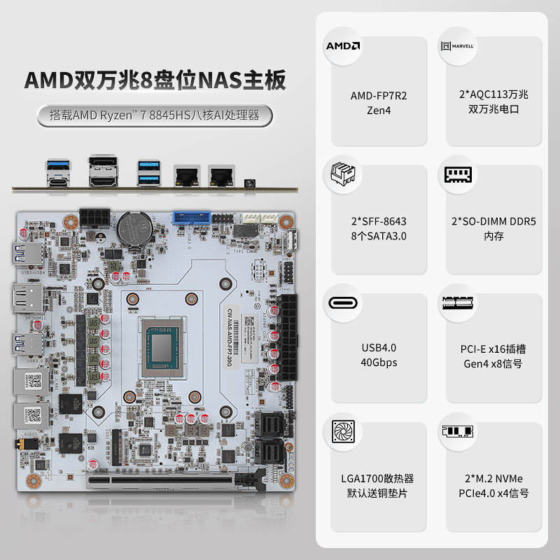 畅网微控畅网新品AMD R7-8845HS DDR5 群晖飞牛Turenas 8盘位万兆NAS主板 AMD-8845HS 八盘位(不含电源) 无内存+无硬盘 含板板铜片(准系统)