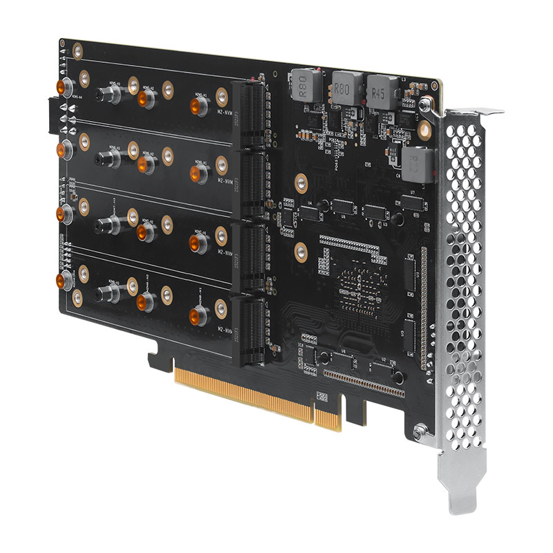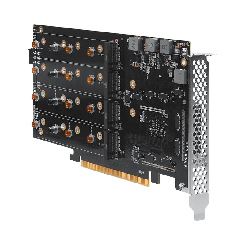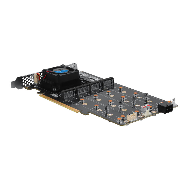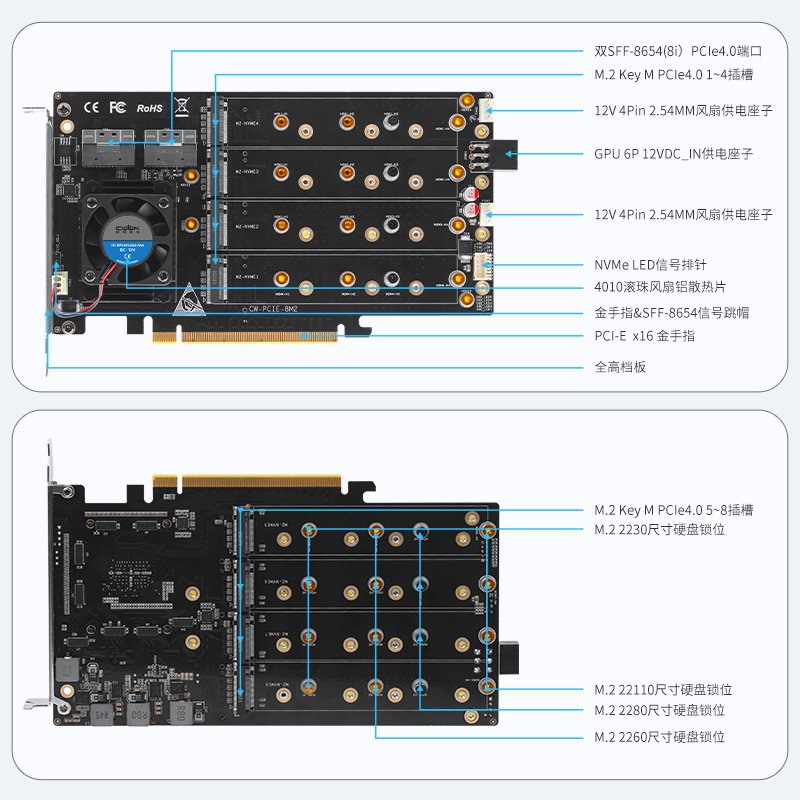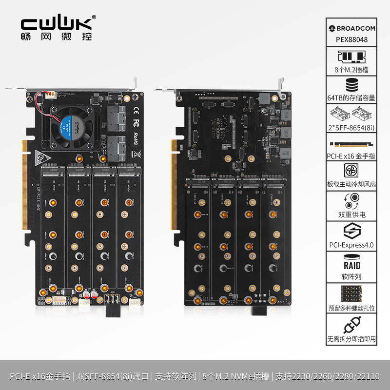 畅网微控 博通PEX88048 PCle4.0主控 无需驱动 免拆分 PCI-Ex16金手指|双SFF-8654(8i)端口|支持软阵列|8个M.2 NVMe插槽|支持2230/2260/2280/22110