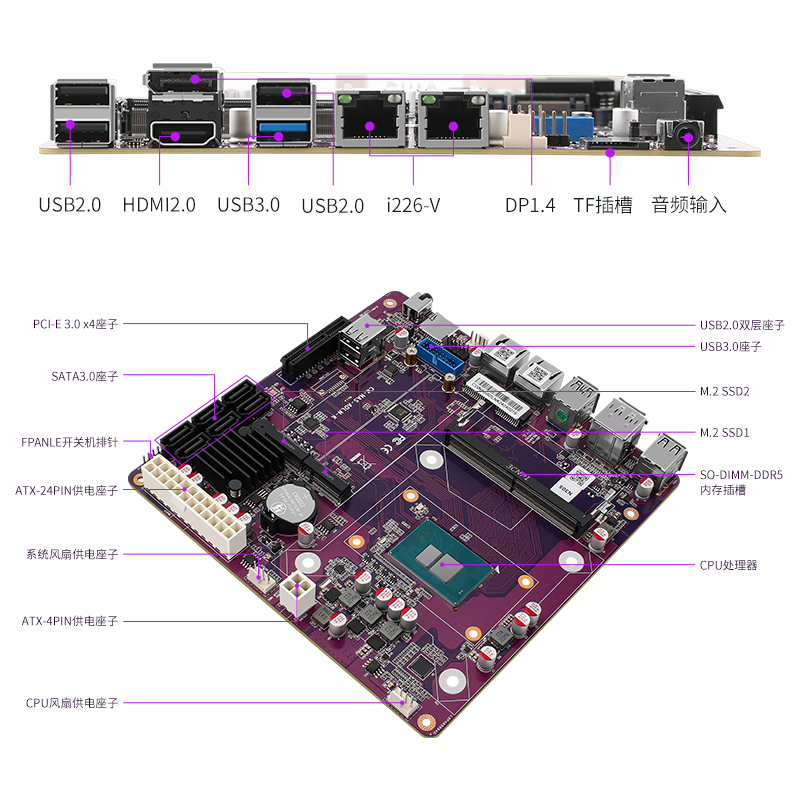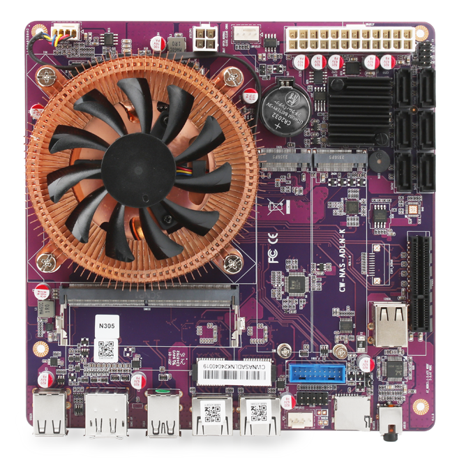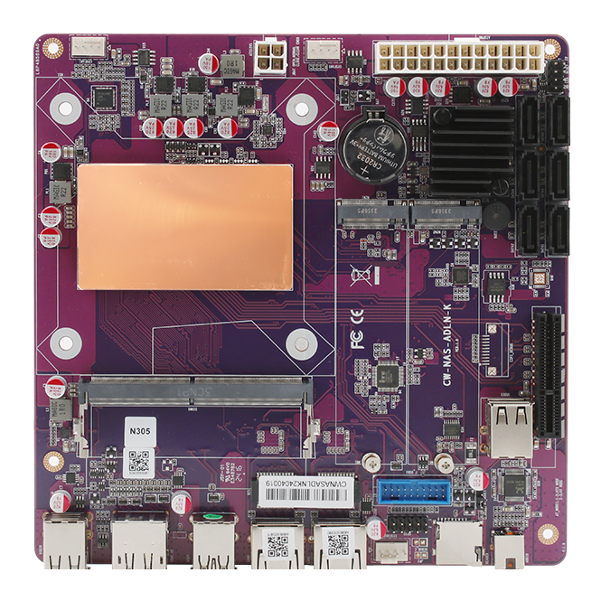 | 内部1/O接口 | 1 * SYSFAN1(支持PWM) - 1 * SYSFAN2(不支持PWM) - 1 * 4PinATX CPU 电源供电 - 1 * 24PinATX 主板 电源供电 - 1 * USB3.0座子 - 2 * M.2 NVMe Pcle3.0 x1 2280 - 1 * SO-DIMM DDR5 单内存插槽 - 6 * SATA3.0(ASM1166) - 1 * 开关机插针(FPANEL插针) - 1 * 蜂鸣器 - 1 * PCle x4插槽(PCle 3.0 x4信号) - 1 * USB2.0座子(卧式,可插加密狗等U盘) - 1 * USB3.0插针 - 1 * GPIO 排针 |