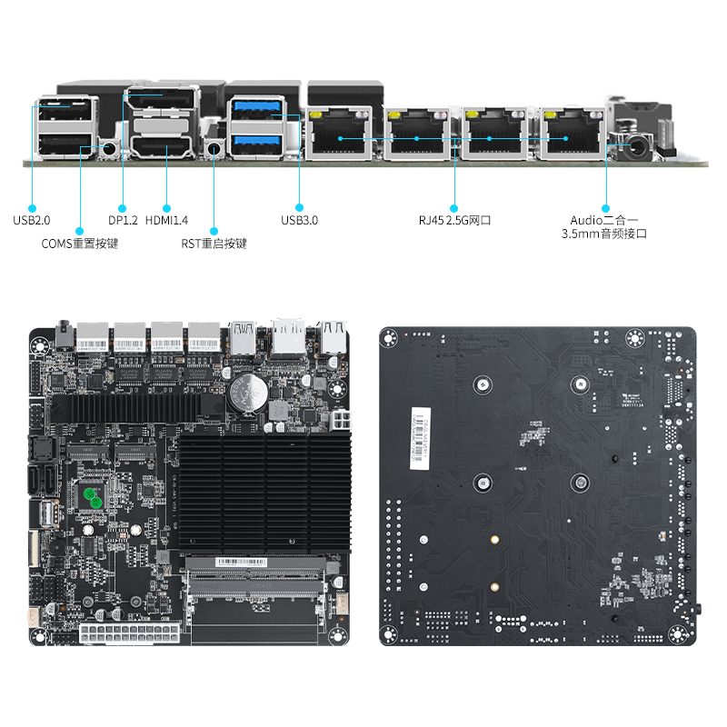 2 * USB2.0 - 1 * 开关机按键 - 2 * USB3.0 - 1 * RST重启/GPIO按键 - 1 * HDMI - 1 * DP - 4 * RJ45 2.5G网口 - 1 * AUDIO二合一3.5mm音频接口 |