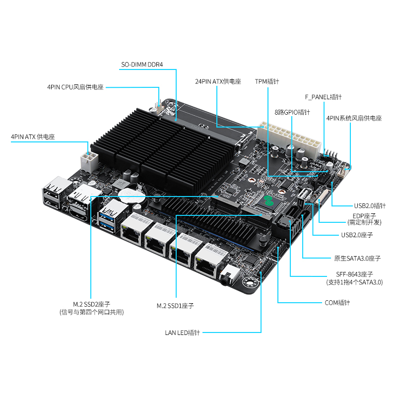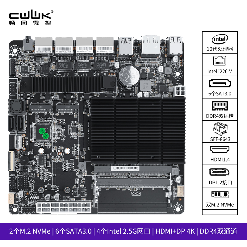1 * SFF-8643 支持1拖4个SATA - 2 * M.2 NVMe x1信号(2280) - SATA1-2口为原生接口 |