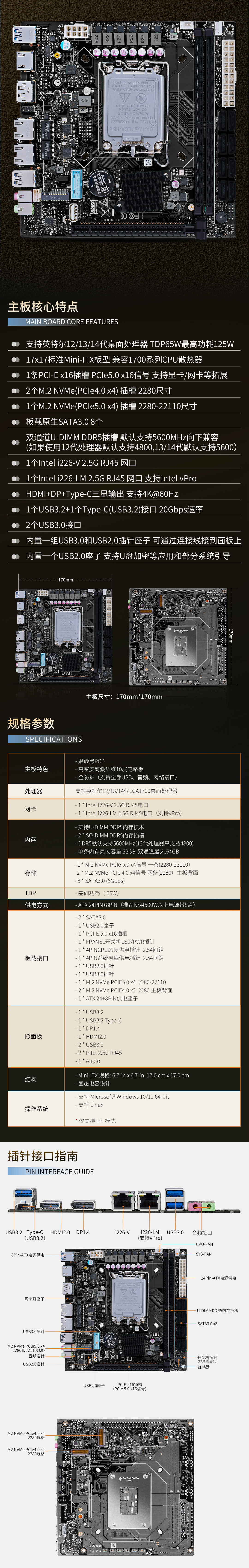 前面介绍了我们这款主板的故事背景,总结下这款主板主要特色;1.必须支持Intel 12/13/14代桌面CPU处理器全兼容。2.8个原生SATA3.0 6Gbps接口,无需芯片转换支持RAID 0/1/5/10软阵列。 3.3条M.2 NVMe 正面一条支持PCIe5.0 x4速率支持2280/22110尺寸,背面还有2条M.2 PCIe4.0 x4速度的M.2 支持2280尺寸。4.预计一条PCI-E X16 PCIe5.0信号的插槽,支持显卡/网卡等应用。5.2个Intel 2.5G LAN口,LAN1口为i226-V 2.5G普通2.5G网口,LAN2为i226-LM (支持vPro远程管理功能的2.5G网口) 6.显示功能全都有HDMI+DP双显4k@60Hz。